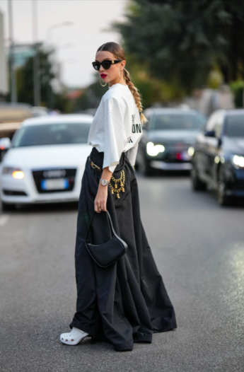 Білу футболку можна носити будь з чим. А от якщо ви хочете оверсайзфутболку поєднати з максіспідницею, заправте її повністю або хоча б невеликий край – так ви зможете окреслити талію.