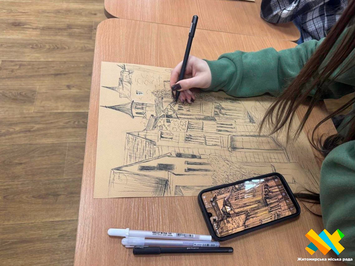 Сьогодні на занятті діти працюють над графічними малюнками — вчаться передавати форму, світлотінь і настрій за допомогою олівця.