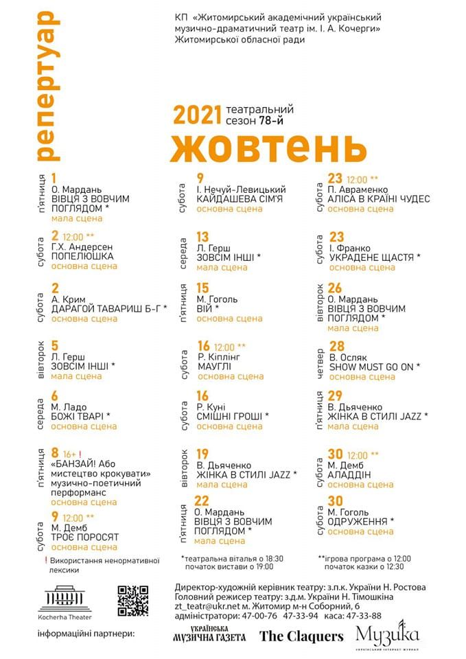 Житомирський драмтеатр запрошує на вистави жовтня 20 хвилин (Житомир) share 1 chat_bubble 0 visibility 148 Новий театральний сезон стартував! Хочете отримувати новини першими – приєднуйтеся до нас у соцмережах Telegram Facebook Instagram Дізнавайтесь про новини швидше! Додай 20 хвилин собі на екран Встановити Коментарі Опублікувати коментар