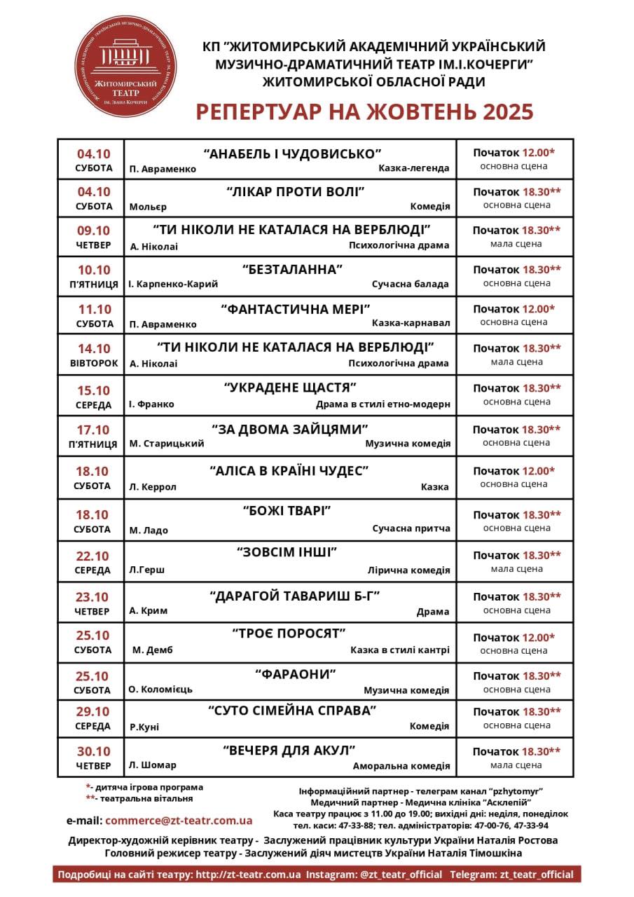 Житомирський музично-драматичний театр запрошує: репертуар жовтня