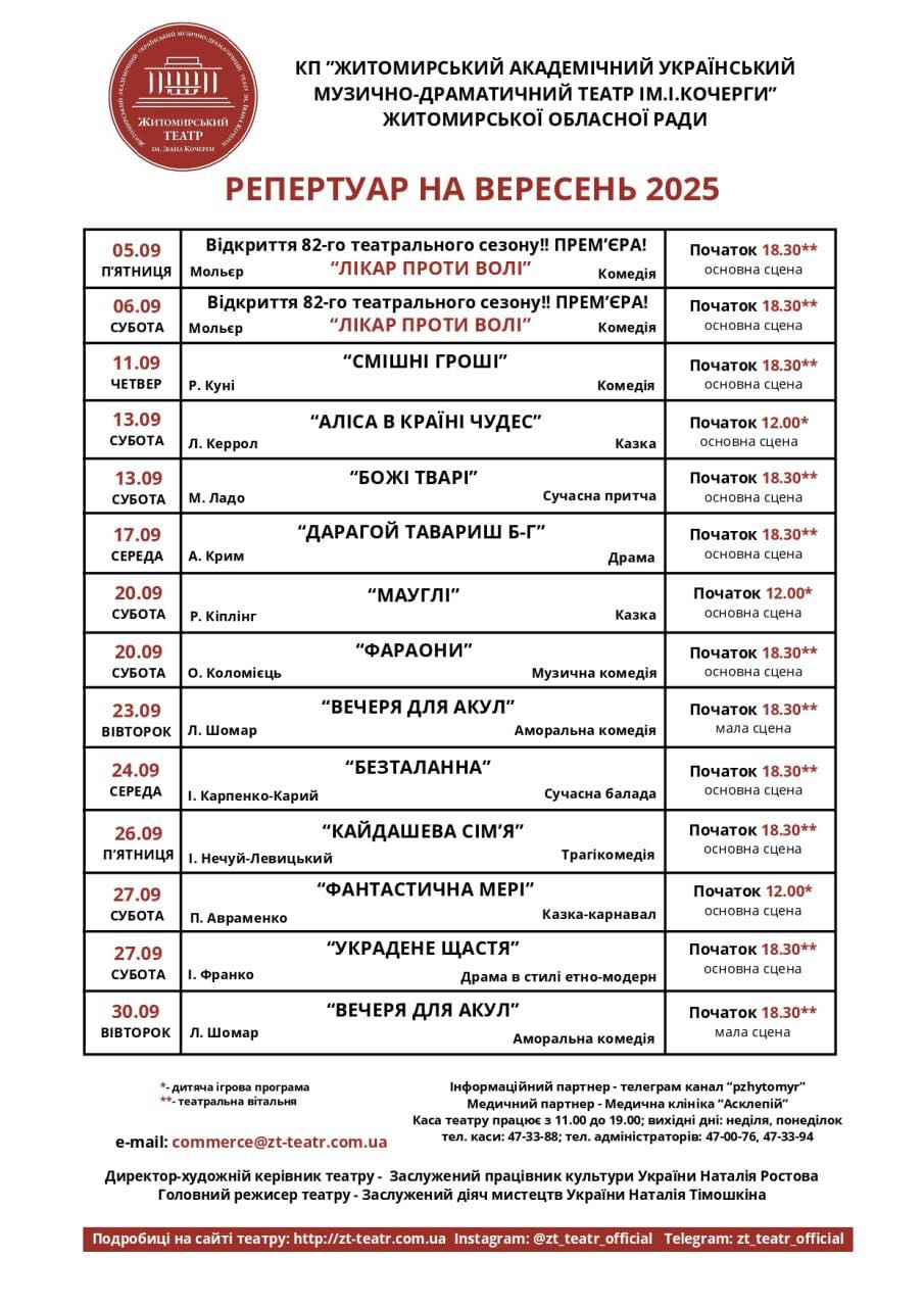 Житомирський театр імені І.Кочерги розпочинає сезон: репертуар на вересень 2025