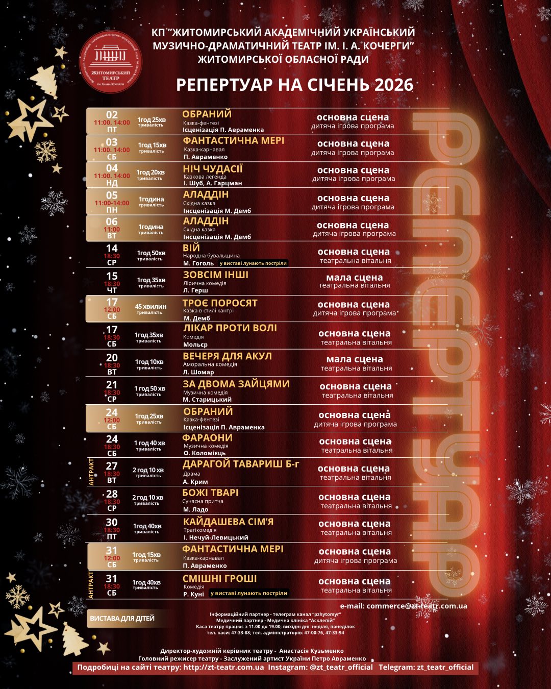 Житомирський академічний український музично-драматичний театр імені Івана Кочерги запрошує глядачів на вистави у січні.