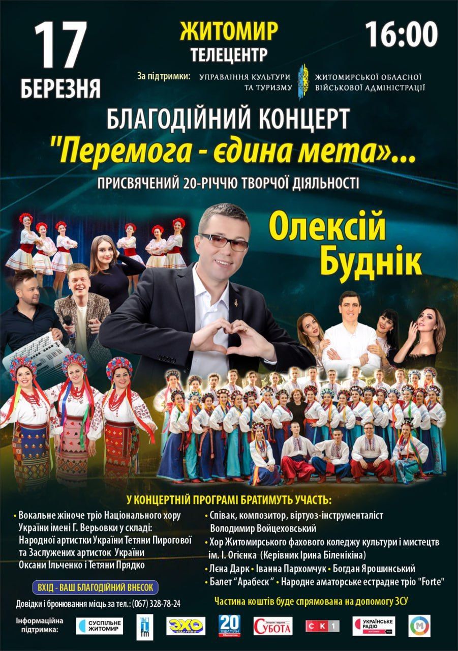 Вокальне жіноче тріо хору ім. Г. Верьовки; ( Київ ) Володимир Войцеховський ( Одеса ); Хор Житомирського фахового коледжу культури; Лєна Дарк; Іванна Пархомчук; Богдан Ярошинський; Шоу-балет " Арабеск "; Тріо " Forte " Вхід - благодійний внесок Бронювання місць за тел. 0673287824 Частину коштів буде спрямовано для Третьої ОДШБ 1 штурмовий батальйон, для купівлі всюдихідного спец авто Spece Gear. Для швидкої евакуації поранених та бойових задач.