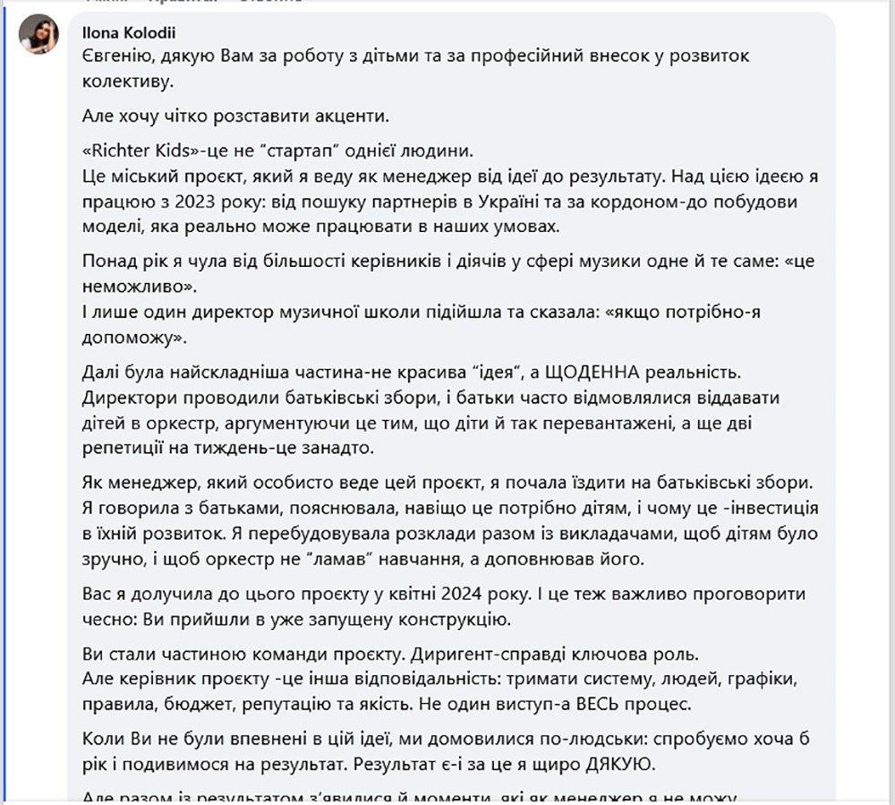 Водночас начальниця управління культури Житомирської міської ради Ілона Колодій публічно пояснила позицію міської влади. За її словами, Richter Kids є міським проєктом, над яким вона працювала з 2023 року як менеджер — від ідеї та пошуку партнерів до організації навчального процесу й комунікації з батьками. Вона наголосила, що диригент був важливою, але не єдиною складовою проєкту, і долучився до вже запущеної структури.