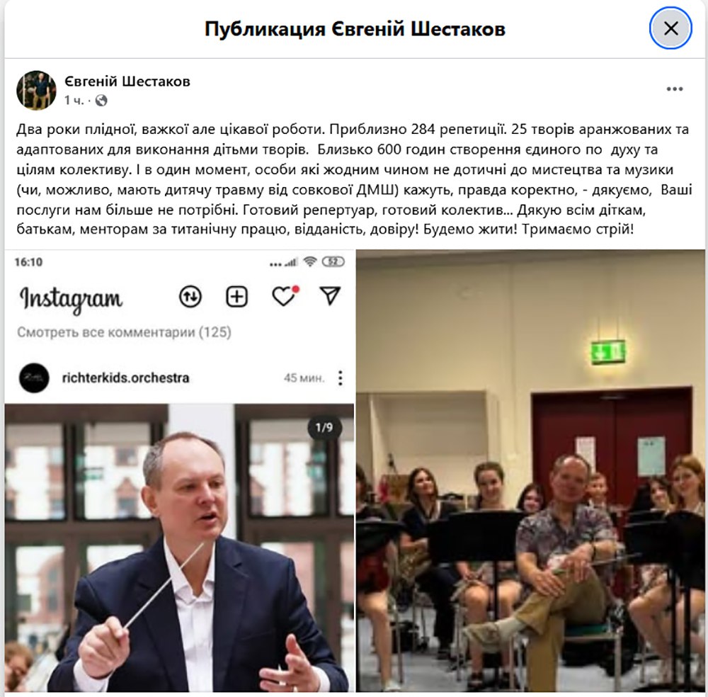 Євгеній Шестаков у своєму дописі зазначив, що протягом двох років працював із оркестром, провів сотні репетицій, аранжував і адаптував для дітей понад два десятки музичних творів та разом із юними музикантами формував колектив як єдиний творчий організм. За його словами, рішення про припинення співпраці було для нього несподіваним, адже колектив мав сформований репертуар і напрацьований концертний досвід.