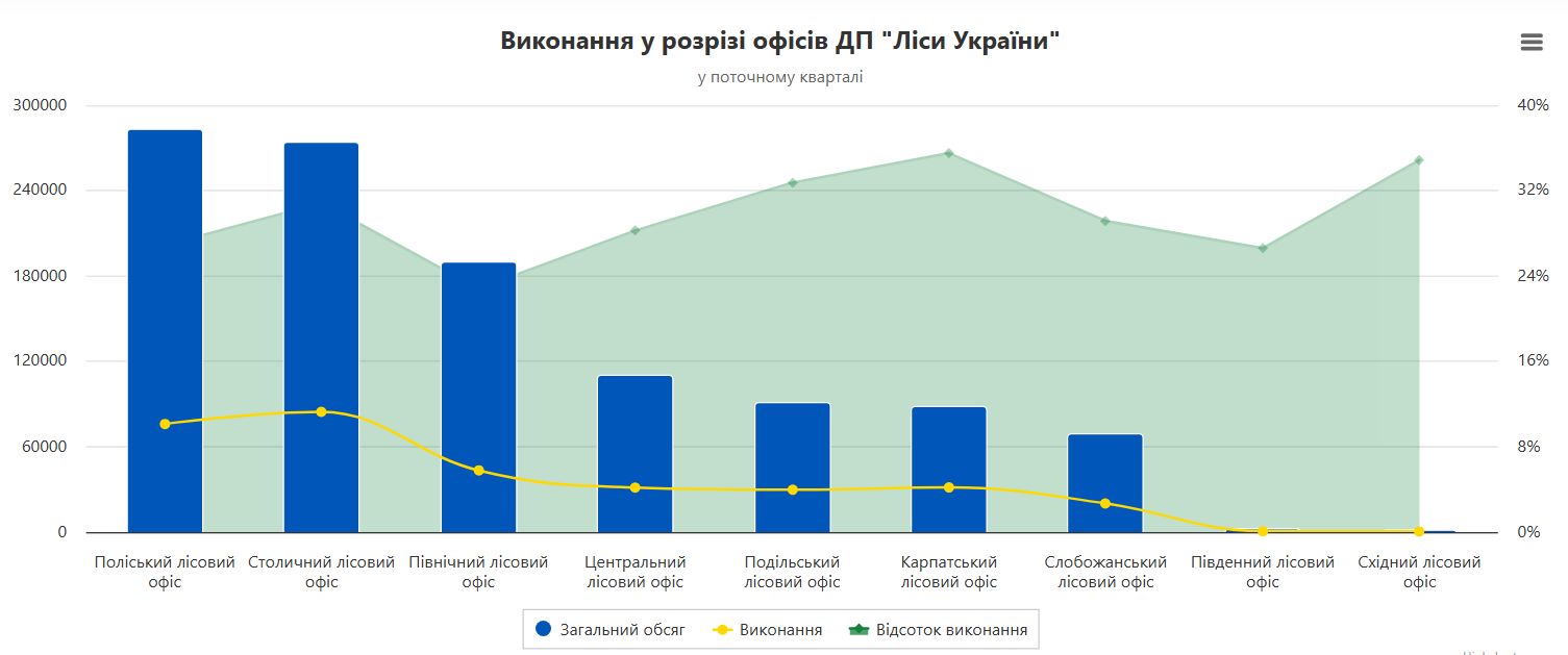 Щодо офісів ДП «Ліси України». Найбільше необробленої деревини продав Поліський лісовий офіс – 282 863 м3, фактично реалізовано 76 002,75 м3 (26,87%).