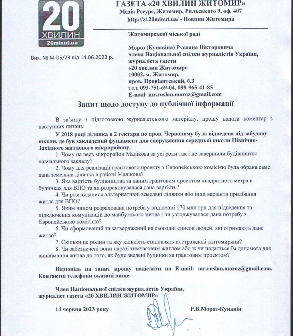 - Ми також одні із перших подали в Єврокомісію заявку на будівництво житла для ВПО на 12 млн євро. Єврокомісія затвердила місто Житомир, вже працювали технічні консультанти від цього проєкту, тому найближчим часом ми очікуємо фінансування для будівництва більше 200 квартир, – стверджував в інтерв'ю Житомирський міський голова Сергій Сухомлин.